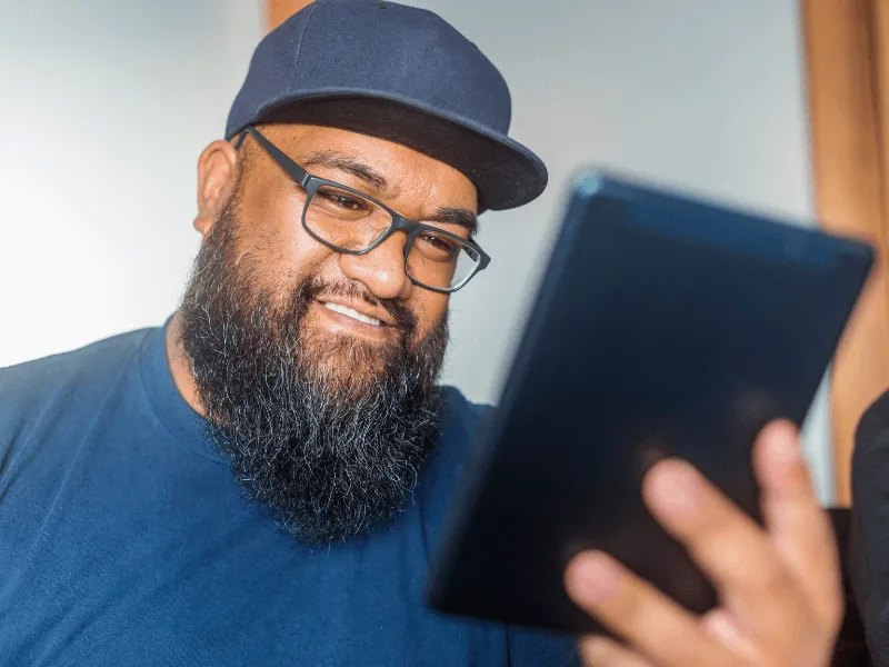 A bearded man wearing glasses and a navy cap smiles while looking at a tablet screen.