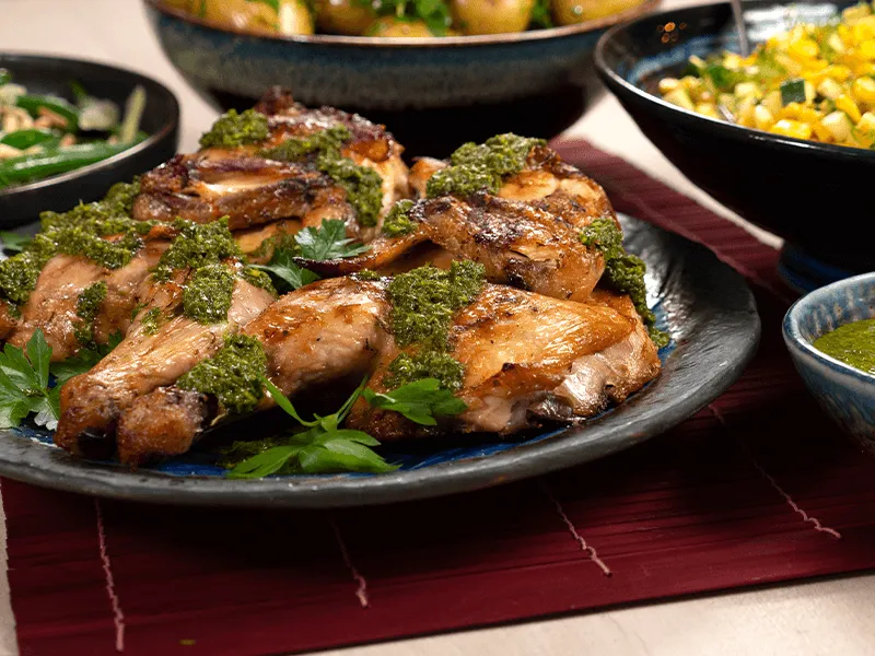 This BBQ chicken is the perfect blend of zesty and fresh, making it a standout dish for any summer gathering. Start by marinating skinless chicken breasts in a mixture of lemon juice, garlic, olive oil, and a touch of wholegrain mustard. The lemon marinade tenderises the chicken and infuses it with a bright, tangy flavour. Once grilled to perfection, top the chicken with a fresh parsley and lemon sauce made from finely chopped parsley, lemon zest, garlic, and a light drizzle of olive oil. This dish is packed with fresh, tangy flavours and is a great way to serve lean protein.