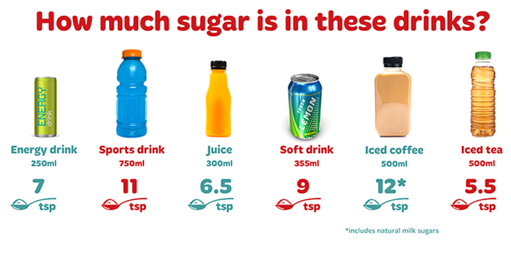 energy drink -250ml 7tbs, soft drinks -  750ml 11 tsp, juice-300ml, 6.5 tsp, soft drink- 355ml 9 tsp, iced coffee - 500 ml 12tsp, iced tea - 500ml 5.5 tsp