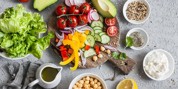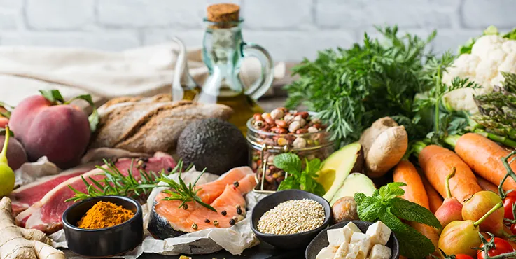 Base dishes around plenty of vegetables, whole grains and healthy fats. Meals can be vegetarian, contain fish and seafood, poultry, eggs or small amounts of red meat.