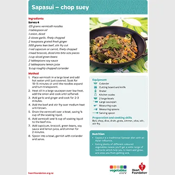 Learning to cook with vegetables can help children make healthy food. Our sapasui - chop suey recipe shows students how to cook a tasty and nutritious meal, while using Pasifika flavours.