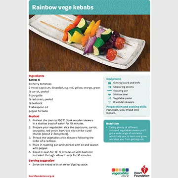 Looking for fun, easy and healthy recipes for children? Our rainbow vege kebabs recipe encourages them to get creative, while learning basic skills for cooking healthy food.