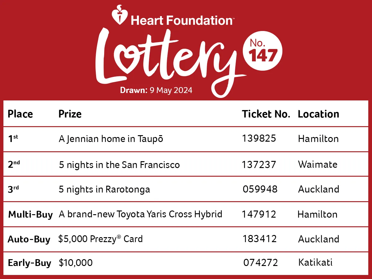 An image of the ticket winners of Heart Foundation Lottery No.149