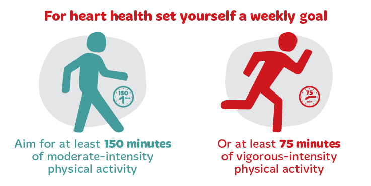 Gradually build your activity levels with the aim of doing at least 2.5 hours (150 minutes) of physical activity each week that makes you breathe harder, but you should still be able to talk. Any progress will improve your heart health.