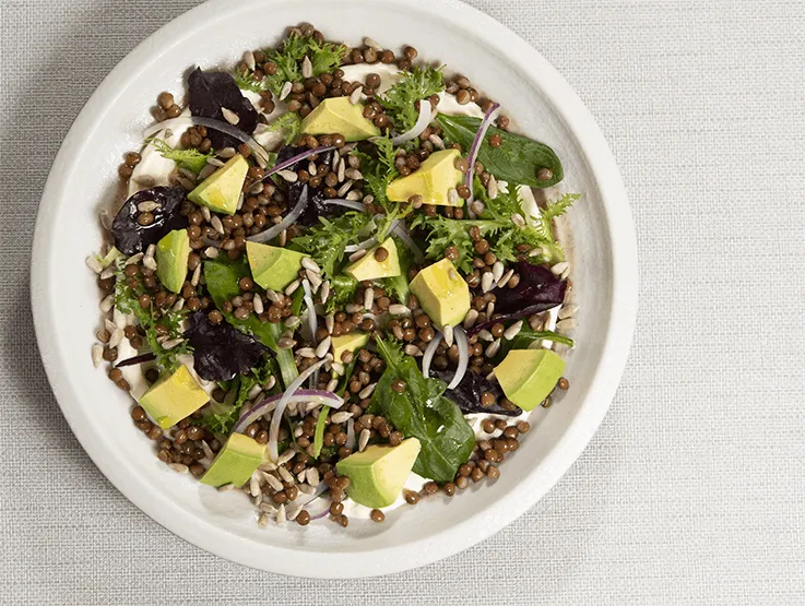 3. Spread the salad leaves, avocado, lentils, sunflower seeds and red onion over the top.