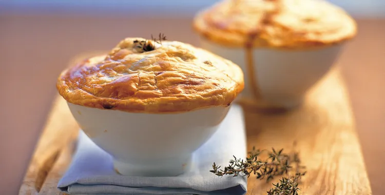 6. Spoon the filling into the pie dishes. Brush the edges of each pastry circle with a little water  then cover the dishes (damp side down); pressing the pastry to the side of the dish to seal.