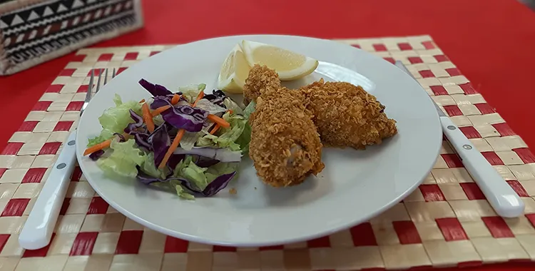 6. Coat chicken with the seasoned wholemeal flour, dip into egg mixture then coat with the crushed cornflakes.