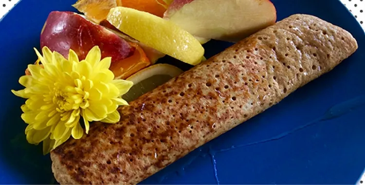 3. Heat a large non-stick frying pan and spray with cooking oil. Pour a small amount of mixture into the pan, swirl to ensure mixture is even across the bottom of the pan (size of the pancakes is up to the individual). When small bubbles form in the top of the mixture flip over to cook the other side. When the second side is cooked remove to a plate and keep warm. Continue with remainder of mixture.