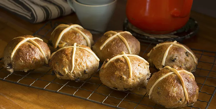 Here is a lighter version of the classic Easter hot cross buns. They're full of fruit and spice and are unbeatable fresh out of the oven.