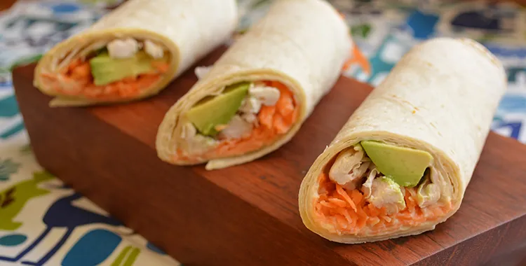 2. Place grated carrot, sliced avocado and shredded chicken in a line across the wrap
