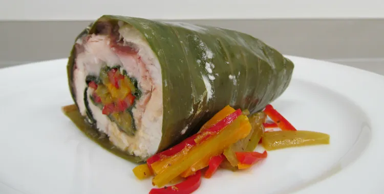 8. Using the gladwrap roll up the banana leaf (like rolling sushi) and twist each end to close