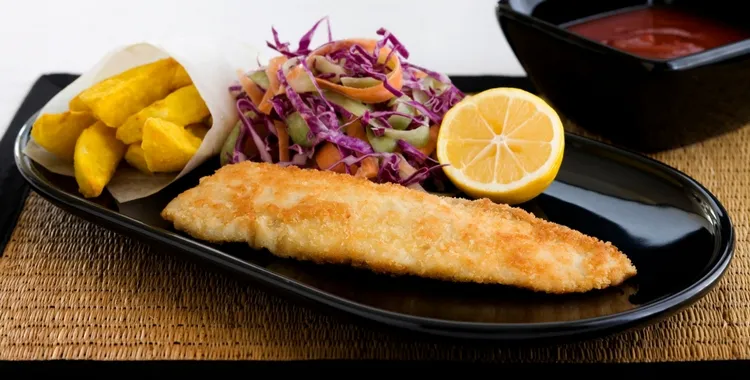 2. Put fish on a plate, with a good helping of salad, some chips, and tomato sauce