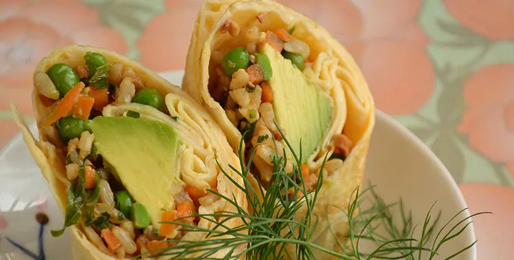 7. Place a spoonful of rice mixture in middle of each omelette along with a piece of avocado
