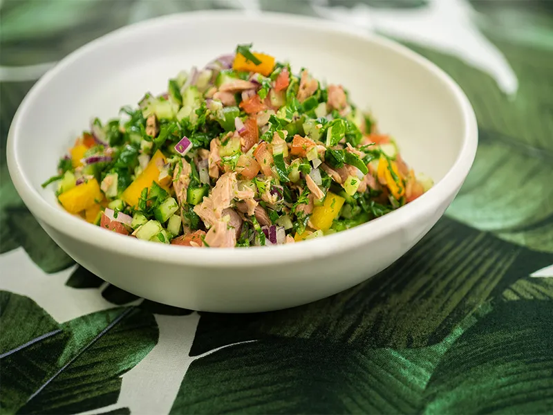 3. Combine all the vegetables in a large bowl. Add the tuna flakes.
