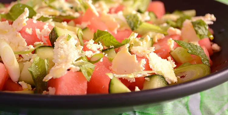 This watermelon and feta salad is bursting with fresh flavours, the melon is contrasted beautifully with the feta.